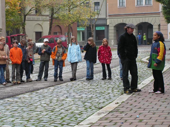 Am nächsten Tag frühstückten wir gemütlich. Danach machten wir uns ein Lunchpaket, das ein Schnitzelweckle, Obst, etwas Süßes und ein Getränk enthielt. Danach packten wir unser Gepäck zusammen und stiegen mit Gepäck in den Bus ein. Nun fuhren wir zum Startplatz der Stadtrallye. Dann gingen wir in den vorher eingeteilten Gruppen los. Jede Gruppe hatte zwei Betreuer. Uns wurden einige Fragen gestellt wie z.B. „Wer hat sich in der Frauenkirche mit einem Fußabdruck verewigt?“ ... .